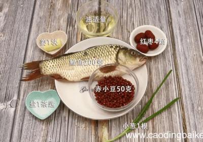 步骤1准备食材:鲤鱼200克、赤小豆50克、姜1块、小葱1根、红枣4颗、盐1茶匙、油适量 。步骤2姜切片 。步骤3葱切葱花 。步骤4鲤鱼杀洗干净,身上打上花刀 。步骤5赤小豆先用水浸泡1小时 。步骤6红枣去核切片 。步骤7锅中倒油,油热放入...