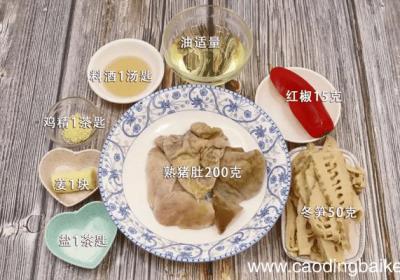步骤1准备食材:熟猪肚200克,冬笋50克、姜1块、红椒15克、盐1茶匙、鸡精1茶匙、料酒1汤匙、油适量 。步骤2将猪肚切片 。步骤3姜切片备用 。步骤4冬笋改小片备用 。步骤5红椒切段 。步骤6起锅倒油,油热加入姜片爆香 。步骤7再加入冬...