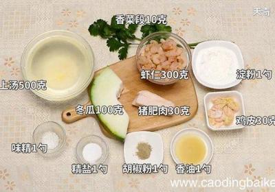 步骤1准备食材:虾仁300克、鸡皮30克、猪肥肉30克、冬瓜100克、香菜段10克、淀粉1勺、精盐1勺、味精1勺、胡椒粉1勺、香油1勺、上汤500克 。步骤2将虾仁洗净,剁成虾泥,再放入碗中 。步骤3加入肥膘肉粒、精盐、味精、胡椒粉、香油、...