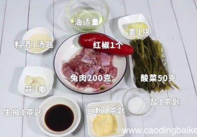 步骤1准备食材:兔肉200克、酸菜50克、蒜3瓣、姜1块、红椒1个、豆粉1茶匙、料酒1汤匙、盐1茶匙、生抽1茶匙、油适量步骤2酸菜切末 。步骤3红辣椒切粒 。步骤4蒜切片 。步骤5姜切片 。步骤6兔肉里加入豆粉、料酒拌匀 。【酸菜兔肉 酸菜...