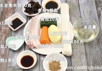 步骤1准备食材:五花肉100克、挂面200克、水发黑木耳10克、醋1茶匙、盐1茶匙、老抽1茶匙、生抽1茶匙、十三香1茶匙、油适量、胡萝卜20克、黄瓜20克、土豆20克 。步骤2五花肉洗净切片 。步骤3土豆去皮切丁 。步骤4胡萝卜切丁 。步骤...