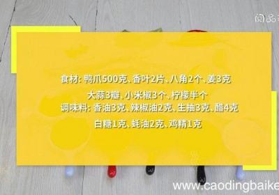 步骤1食材:鸭爪500克、香叶2片、八角2个、姜3克、大蒜3瓣、小米椒3个、柠檬半个 。调味料:香油3克、辣椒油2克、生抽3克、醋4克、白糖1克、蚝油2克、鸡精1克 。步骤2姜切片 。步骤3大蒜切末 。步骤4小米椒切小圈 。步骤5鸭爪冷水下...
