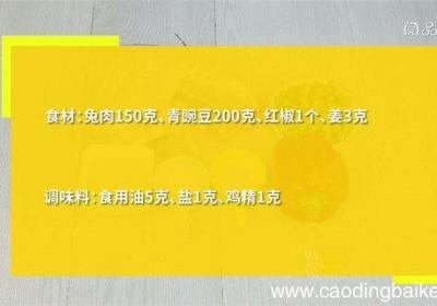 步骤1食材:兔肉150克、青豌豆200克、红椒1个、姜3克 。调味料:食用油5克、盐1克、鸡精1克 。步骤2兔肉切丁 。步骤3红椒切丁 。步骤4【豌豆烧兔肉怎么做 豌豆烧兔肉做法是什么】姜切末 。步骤5炒锅中油温5成热时,放入兔肉丁,炒至变...