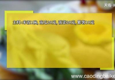 步骤1所需食材:米饭1碗,南瓜20克,菠菜20克,紫薯10克 。步骤2菠菜焯水,倒入搅拌机中加入少许温水,打成菠菜泥 。步骤3菠菜汁中加入米饭,混合均匀 。步骤4紫薯、南瓜上锅蒸15分钟,分别碾成泥 。步骤5将南瓜泥和紫薯泥分别加入米饭,混...