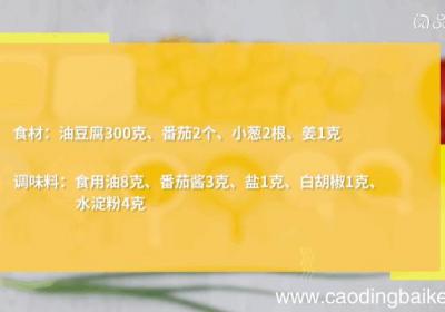 步骤1【番茄炒油豆腐做法番茄炒油豆腐怎么做】准备食材:油豆腐300克、番茄2个、小葱2根、姜1克、食用油8克、番茄酱3克、盐1克、白胡椒1克、水淀粉4克 。步骤2油豆腐洗净、对半切开 。步骤3番茄去皮、切小丁 。步骤4小葱切葱花、姜切末 。...