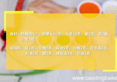 步骤1食材:鸡胸肉1个、胡萝卜50克、大葱10克、姜2克、蒜2瓣、小葱1根调味料:盐1克、生抽2克、麻油5克、白糖2克、白芝麻3克、料酒2克、醋1克、辣椒油3克、花椒1克步骤2胡萝卜切丝 。步骤3大葱切段 。步骤4姜切末 。步骤5蒜切末 。...