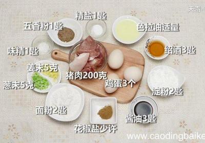 步骤1准备食材:猪肉200克、鸡蛋3个、葱末5克、姜末5克、淀粉2匙、面粉2匙、酱油3匙、绍酒3匙、精盐1匙、味精1匙、五香粉1匙、花椒盐少许、色拉油适量 。步骤2将猪肉剁成肉馅,装入碗中 。步骤3加入葱末、姜末、清水搅匀 。步骤4再用精盐...