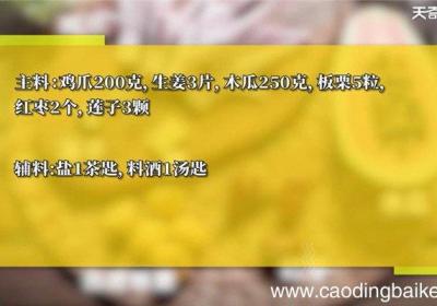 步骤1所需食材:鸡爪200克,生姜3片,木瓜250克,板栗5粒,红枣2个,莲子3颗 。所需调料:盐1茶匙,料酒1汤匙 。【板栗木瓜凤爪汤怎么做 板栗木瓜凤爪汤的做法】步骤2鸡爪剪去指甲,冷水入锅,加料酒,煮5分钟捞出 。步骤3木瓜去籽,削皮...