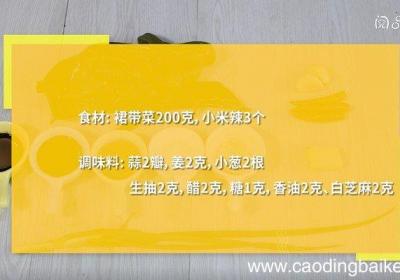 步骤1食材:裙带菜200克,小米辣3个,蒜2瓣,姜2克,小葱2根 。调味料:生抽2克,醋2克,糖1克,香油2克、白芝麻2克 。步骤2裙带菜用沸水涮洗2次,取出沥干,装盘 。步骤3小米辣切末 。步骤4【凉拌裙带菜怎么做 凉拌裙带菜的做法】姜切...