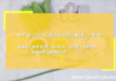 步骤1食材:虾仁200克、荷兰豆150克、姜2克、小葱2根 。调味料:食用油5克、料酒2克、盐1克、淀粉1克、生抽2克、胡椒粉2克 。步骤2姜切末、小葱切葱花 。荷兰豆去筋 。步骤3虾仁加料酒、淀粉、姜末、拌匀、腌制15分钟 。【去皮大虾怎...