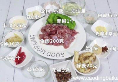 步骤1准备材料:兔肉200克、仔姜20克、姜1块、青椒1个、小米椒3个、泡椒10克、花椒5克、蒜3瓣、料酒1汤匙、盐1茶匙、鸡精1茶匙、白胡椒1茶匙、淀粉1茶匙、八角1个、油适量步骤2兔肉改小块,冷水洗净滤干备用 。步骤3青椒切块 。步骤4...
