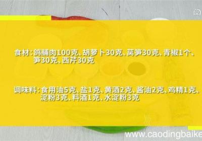 步骤1食材:鸽脯肉100克、胡萝卜30克、莴笋30克、青椒1个、笋30克、西芹30克调味料:食用油5克、盐1克、黄酒2克、酱油2克、鸡精1克、淀粉3克、料酒1克、水淀粉3克步骤2鸽脯肉切丝、加料酒、淀粉,拌匀上浆 。步骤3胡萝卜切丝 。步骤...