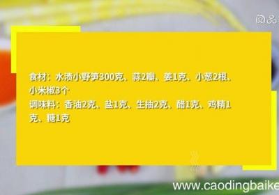 步骤1食材:水渍小野笋300克、蒜2瓣、姜1克、小葱2根、小米椒3个 。调味料:香油2克、盐1克、生抽2克、醋1克、鸡精1克、糖1克 。步骤2水渍小野笋用清水清洗2次,捞出,切片 。步骤3蒜切末 。步骤4姜切末 。步骤5小葱切葱花 。步骤6...