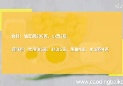 步骤1准备食材:油豆腐300克、小葱2根、食用油5克、蚝油5克、生抽4克、水淀粉4克 。步骤2油豆腐洗净、对半切开 。步骤3小葱切葱花 。步骤4热锅倒油、油温5成热、下蚝油、生抽、炒至融化、倒入油豆腐、炒匀、加300毫升清水、焖煮5分钟、淋...