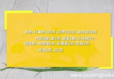 步骤1食材:红薯粉100克、花甲200克、金针菇50克、大蒜3瓣、姜3克、香菜1颗、小米椒3个 。调味料:食用油5克、豆瓣酱3克、生抽2克、蚝油1克、盐2克 。步骤2红薯粉用清水泡软,花甲放入清水中,浸泡吐沙 。步骤3大蒜切末 。步骤4姜切...