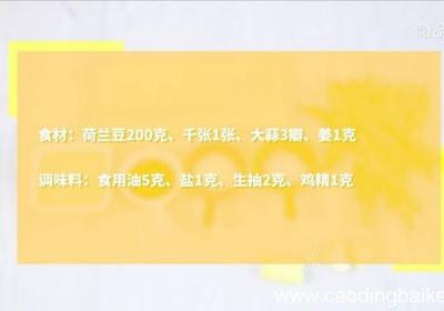 步骤1食材:荷兰豆200克、千张1张、大蒜3瓣、姜1克 。调味料:食用油5克、盐1克、生抽2克、鸡精1克 。步骤2荷兰豆去筋,千张切长条,大蒜切末,姜切末 。步骤3热锅倒油,油温5成热时,下姜、蒜,爆香 。步骤4倒入荷兰豆,煸炒至断生 。步...