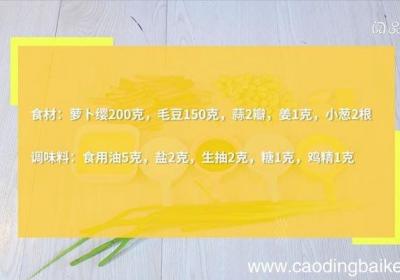 步骤1食材:萝卜缨200克,毛豆150克,蒜2瓣,姜1克,小葱2根调味料:食用油5克,盐2克,生抽2克,糖1克,鸡精1克步骤2萝卜缨洗净,切小段 。步骤3蒜切片 。【萝卜缨炒毛豆的做法 萝卜缨炒毛豆】步骤4姜切片 。步骤5小葱切葱花 。步骤...