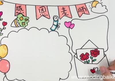 【教师节感恩手抄报 教师节感恩手抄报画法】1.首先在顶部画一个横幅,写上主题感恩老师的主题文字;2.左下角画上气球,右下角画上贺卡,在气球和贺卡周围画上边框,再画一些装饰的小元素;3.给上方的文字边框和周围的元素涂上不同颜色,花朵涂上不同颜...