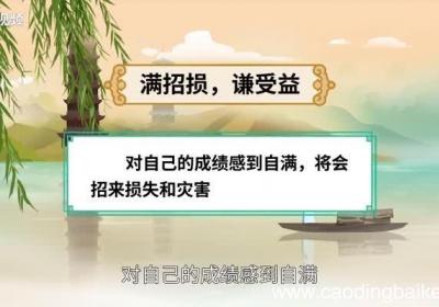 “满招损,谦受益”意思是对自己的成绩感到自满,将会招来损失和灾害;谦虚而时时改掉自己的不足,就能因此而得益处 。出自《尚书·大禹谟》:“惟德动天,无远弗届,满招损,谦受益,时乃天道 。”老子说:“不自以为是的人,才能够对事情判断分明;不自夸...