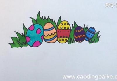 1、我们先画出五个蛋 。2、再画出蛋周围的小草 。3、给蛋们画上不同的花纹 。4、用蓝色把第一个蛋底色涂满,粉色把蛋上面的斑点涂满;肉色把第二个蛋底色涂满,深蓝色和黄色把花纹涂满;黄色把第三个蛋底色涂满,深粉色把中间涂满 。5、用橙色把第四...