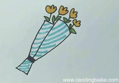 1、我们先画出花束的包装 。【花束简笔画】2、接着画出花朵和枝叶就可以开始上色啦 。3、用黄色把花朵涂满,再用绿色把枝叶涂满 。4、用蓝色在包装上画出条纹就完成啦 。...