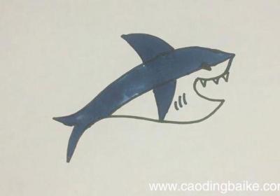 1.首先我们先把鲨鱼的上嘴画出来,接着画身体和尾巴,2.再把鲨鱼的尖牙画出来,再画出身上的纹路,3.再画出背鳍和侧鳍,最后画出腮和眼睛,就可以开始上色,4.用深蓝色把鲨鱼的背部涂满,这样就完成啦 。【鲨鱼的简笔画】...