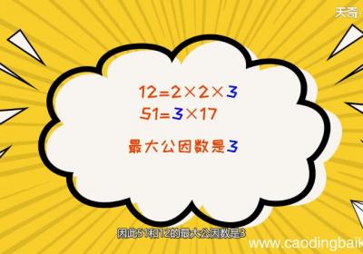 12=2×2×3,51=3×17,因此,51和12的最大公因数是3 。公因数,亦称“公约数”,它是一个能同时整除若干整数的整数 。如果一个整数,同时是几个整数的因数,那么称这个整数,为它们的“公因数” 。公因数中最大的称为最大公因数,对任意...