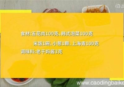 发布时间: 13小时前步骤1食材:五花肉100克、韩式泡菜100克、米饭1碗、小葱1颗、上海青100克 。调味料:老干妈酱3克 。步骤2五花肉切小片 。步骤3泡菜切小段 。步骤4【韩国锅巴饭怎么做 韩国锅巴饭的做法】小葱切葱花 。步骤5上海青对半切开,放入沸水锅...