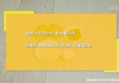 步骤1食材:土豆300克、圣女果10克、食用油15克、盐1克、蓝莓酱5克 。步骤2土豆去皮 。步骤3切长条 。步骤4锅中放水煮沸,放入土豆煮3分钟,捞出,装入保鲜袋中,冷冻至变硬 。步骤5炒锅中油温5成热时,放入土豆条炸软,捞出装盘,撒入盐...