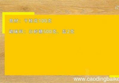 发布时间: 10小时前步骤1食材:干桂花100克 。调味料:白砂糖500克、盐2克 。步骤2干桂花洗净,用清水浸泡5分钟,捞出,晾干水分 。步骤3加入盐拌匀 。步骤4玻璃罐中倒入少许白砂糖 。步骤5再放入桂花 。步骤6一层白砂糖一层桂花 。步骤7最后一层倒入白砂...