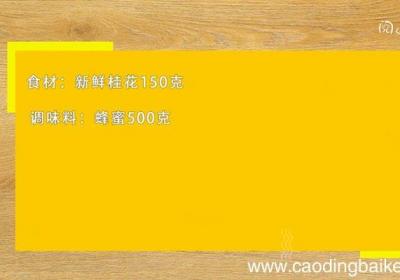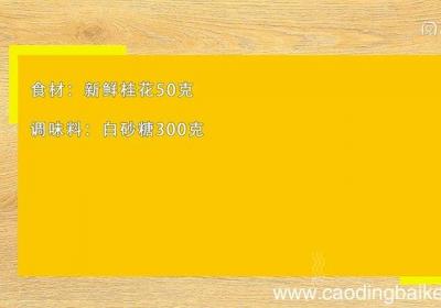 发布时间: 10小时前步骤1食材:新鲜桂花50克 。调味料:白砂糖300克 。步骤2桂花洗净,用清水浸泡5分钟,捞出,晾干水分 。步骤3玻璃罐中倒入少许白砂糖 。步骤4再放入桂花 。步骤5一层白砂糖一层桂花 。步骤6最后一层倒入白砂糖,密封腌制1个月即可食用 。...