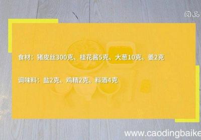 发布时间: 8小时前步骤1食材:猪皮丝300克、桂花酱5克、大葱10克、姜2克、盐2克、鸡精2克、料酒4克 。步骤2【桂花皮丝的做法 桂花皮丝怎么做】姜切片 。步骤3大葱切段 。步骤4猪皮丝用清水浸泡30分钟,切细丝,放入冷水锅中,加葱、姜、料酒,煮8分钟,捞...