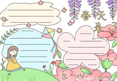 发布时间: 12小时前【春天来了的手抄报 春天来了手抄报】1、写上“春天来了”字样,画上花草,枝条,小女孩放风筝 。2、画上横线 。3、整体涂上颜色 。...