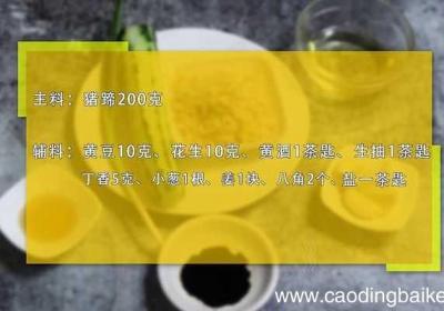 发布时间: 8小时前步骤1准备食材:猪蹄200克、黄豆10克、花生10克、黄酒1茶匙、生抽1茶匙、丁香5克、小葱1根、姜1块、八角2个、盐1茶匙步骤2猪蹄洗净(提前叫老板处理好) 。步骤3黄豆浸泡30分钟 。步骤4花生浸泡10分钟 。步骤5姜切片 。步骤6小葱...