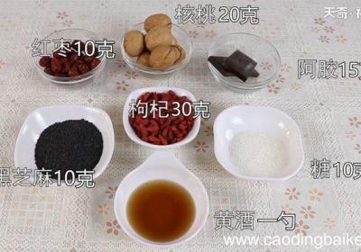 步骤1准备食材:核桃20克,红枣10克,阿胶15克,枸杞30克,黑芝麻10克,黄酒1勺,白糖10克 。步骤2把泡好的阿胶放入锅里中火烧开 。步骤3把泡好的阿胶放入锅里中火烧开,烧开之后转小火。步骤4熬10分钟左右再放入白糖 。步骤5熬半小时...