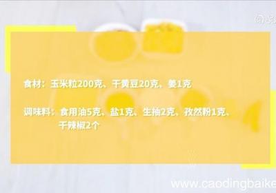 发布时间: 8小时前步骤1食材:玉米粒200克,干黄豆20克,姜1克 。调味料:食用油5克,盐1克,生抽2克,孜然粉1克,干辣椒2个 。步骤2干黄豆用清水浸泡12小时 。步骤3倒入锅中,煮20分钟,捞出 。步骤4姜切末,干辣椒切段 。步骤5热锅倒油,油温5成热...