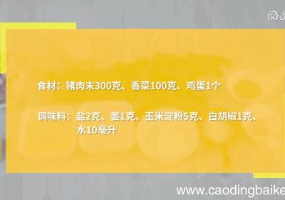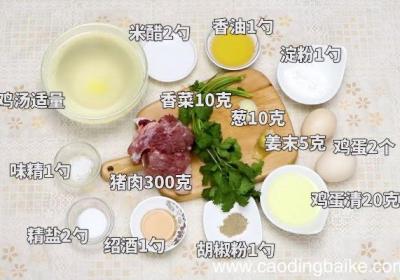发布时间: 14小时前步骤1准备食材:猪肉300克、鸡蛋清2个、香菜10克、葱10克、姜末5克、味精1勺、胡椒粉1勺、水淀粉1勺、香油1勺、绍酒1勺、精盐2勺、米醋2勺、鸡汤适量 。步骤2肥肉去皮切成条,瘦肉切条 。步骤3然后切末,用刀剁成肉馅 。步骤4大葱洗净...