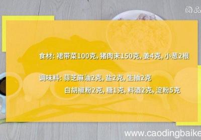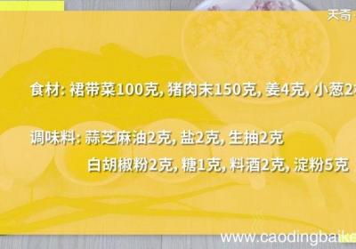 发布时间: 14小时前步骤1食材:裙带菜100克,猪肉末150克,姜4克,小葱2根 。调味料:芝麻油2克,盐2克,生抽2克,白胡椒粉2克,糖1克,料酒2克,淀粉5克 。步骤2裙带菜用沸水涮洗2次,取出备用 。步骤3姜切末 。步骤4小葱切葱花 。步骤5猪肉末加料酒...
