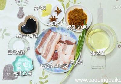 发布时间: 14小时前步骤1准备食材:五花肉200克、腐乳50克、葱1根、姜1块、冰糖15克、八角2个、盐1茶匙、老抽1汤匙、油适量 。步骤2姜切片 。步骤3葱切葱花 。步骤4五花肉切块 。步骤5锅内烧水,水开后下入五花肉焯水捞出备用 。步骤6炒锅中倒入少许油,...