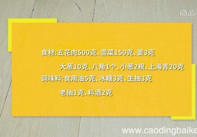 发布时间: 14小时前步骤1食材:五花肉500克、雪菜150克、姜3克、大葱10克、八角1个、小葱2根、上海青20克、食用油5克、冰糖3克、生抽3克、老抽1克、料酒2克 。步骤2上海青对半切开,放入沸水锅中焯烫30秒,捞出备用 。步骤3五花肉切厚块 。步骤4雪菜...