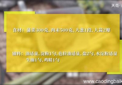 步骤1食材:蒲菜300克、肉末500克、大葱1段、大蒜2瓣、油适量、淀粉1勺、色拉油适量、盐2勺、水淀粉适量、生抽1勺、鸡精1勺 。步骤2蒲菜择去老叶后清水浸泡清洗 。步骤3沥干水分后切段 。步骤4肉末加入淀粉1勺,色拉油适量,盐1勺,搅拌...