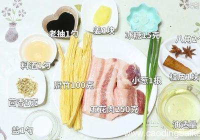 发布时间: 15小时前步骤1准备食材:五花肉250克、腐竹100克、小葱1根、盐1勺、八角2个、茴香5克、桂皮1块、姜1块、冰糖15克、料酒1勺、老抽1勺、油适量 。步骤2【腐竹红烧肉的做法 腐竹红烧肉怎么做】姜切片 。步骤3葱切葱花 。步骤4腐竹切段 。步骤5...