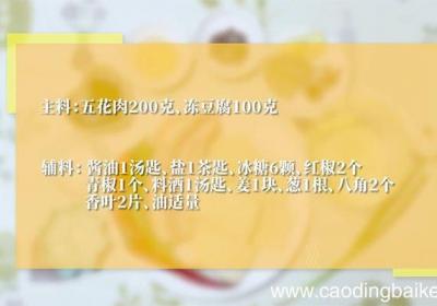 发布时间: 14小时前步骤1准备食材:五花肉200克、冻豆腐100克、酱油1汤匙、盐1茶匙、冰糖6颗、红椒2个、青椒1个、料酒1汤匙、姜1块、葱1根、八角2个、香叶2片、油适量 。步骤2姜切片 。步骤3红椒切片 。步骤4青椒切片 。步骤5葱切葱花 。步骤6冻豆腐...