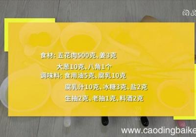 发布时间: 12小时前步骤1食材:五花肉500克、姜3克、大葱10克、八角1个调味料:食用油5克、腐乳10克、腐乳汁10克、冰糖3克、盐2克、生抽2克、老抽1克、料酒2克步骤2五花肉切厚块 。步骤3放入冷水锅中,水沸后,煮10分钟,捞出 。步骤4腐乳加腐乳汁拌匀...