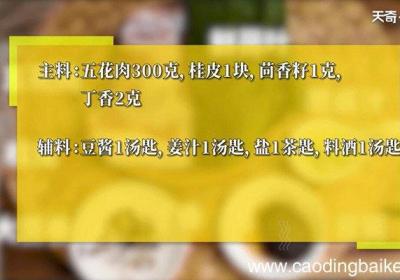 发布时间: 12小时前步骤1主料:五花肉300克,桂皮1块,茴香籽1克,丁香2克 。辅料:豆酱1汤匙,姜汁1汤匙,盐1茶匙,料酒1汤匙 。步骤2五花肉切块 。步骤3加入盐、料酒、豆酱、葱姜汁、丁香、大茴香、桂皮腌制30分钟,捡去香料 。步骤4将荷叶铺在碗中,倒入...