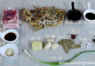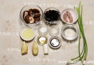 发布时间: 12小时前步骤1准备食材:五花肉100g、冬菇50g、冬笋50g、水发木耳25g、蒜薹25g、葱段10g、姜1小块、精盐1勺、白糖1勺、清水适量、绍酒1勺、酱油2勺、色拉油3大匙 。步骤2将洗净的五花肉切成3厘米见方的块,装盘备用 。步骤3洗净的冬菇...