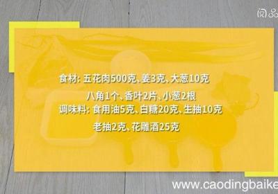 发布时间: 12小时前步骤1食材:五花肉500克、姜3克、大葱10克、八角1个、香叶2片、小葱2根 。调味料:食用油5克、白糖20克、生抽10克、老抽2克、花雕酒25克 。步骤2五花肉切厚块,冷水入锅,水开后煮2分钟捞出,沥干水分备用 。步骤3大葱切段 。步骤4...