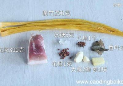 发布时间: 12小时前步骤1准备食材:腐竹200克、五花肉300克、姜1块、大蒜2瓣、花椒1克,八角1个,香叶2片,冰糖5克 。步骤2腐竹放入碗中,倒入适量温水泡软 。【腐竹烧肉的做法 腐竹烧肉怎么做】步骤3姜蒜切片 。步骤4锅中放入适量清水烧开,放入五花肉煮1...