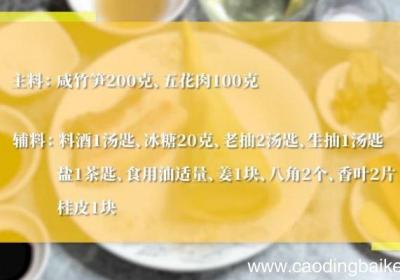 发布时间: 12小时前步骤1主料:咸竹笋200克,五花肉100克 。辅料:料酒1汤匙、冰糖20克、老抽2汤匙、生抽1汤匙、盐1茶匙、食用油适量、姜1块、八角2个、香叶2片、桂皮1块 。步骤2咸竹笋放水中浸泡半小时,然后切段 。步骤3五花肉切块 。步骤4姜切片 。...