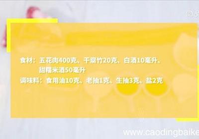 步骤1食材:五花肉400克、干腐竹20克、白酒10毫升、甜糯米酒50毫升 。调味料:食用油10克、老抽1克、生抽3克、盐2克 。步骤2五花肉切块,加盐,拌匀,腌制30分钟 。步骤3干腐竹掰小块,用温水泡发 。步骤4热锅倒油,油温4成热时,下...